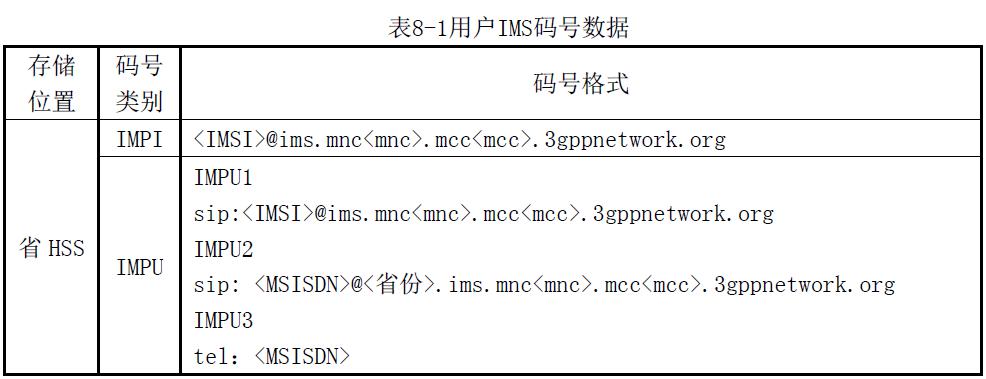 lSIP URI:采用E.164编号+域名方式,具体格式如:sip:+8613901011111@<省份>.ims.mnc<mnc>.mcc<mcc>.3gppnetwork.org。
