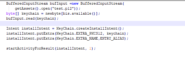 Intent携带了证书内容,就直接创建Intent 启动CertInstaller进行证书安装,例如: