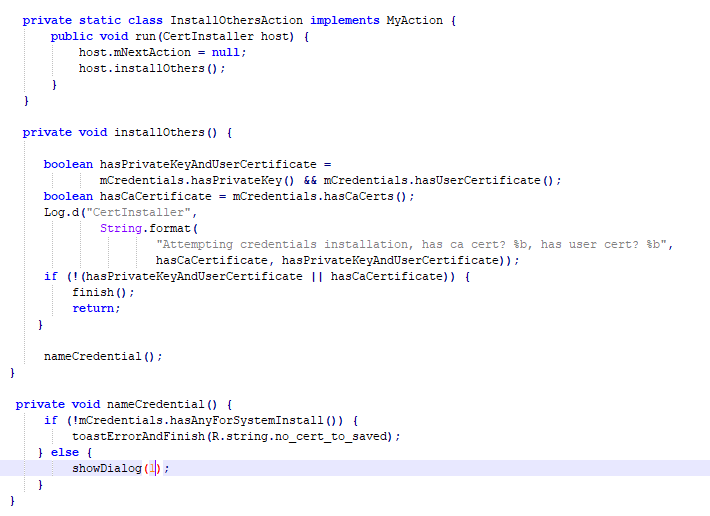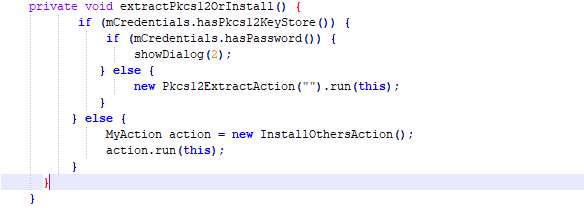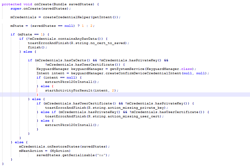 从上面代码可以看出来,在创建CredentialHelper 实例的同时,还做了证书解析操作,这里主要看parseCert(byte[] bytes)函数,其中根据证书的不同会将证书缓存到mCaCerts或mUserCert列表中。然后继续分析CertInstaller的OnCreate函数,继续往下看对当前的环境进行校验,其中keyguardManager.createConfirmDeviceCredentialIntent(null, null); 是检查是否设置信任凭证。然后会调用到extractPkcs12OrInstall函数。