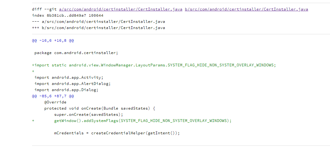 从上图可以看到在CertInstaller.java代码的onCreate方法中添加了一个系统属性” SYSTEM_FLAG_HIDE_NON_SYSTEM_OVERLAY_WINDOWS”,添加此属性的目的就是屏蔽掉其他APP的悬浮窗,避免系统界面恶意程序进行覆盖,这样就修复了该漏洞存在的风险,目前官方只在Android8-Android10系统修复了此漏洞。