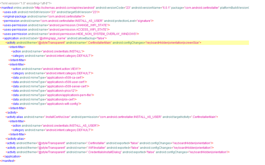 证书覆盖安装漏洞主要体现在系统导入证书的时候,而导入证书这部分功能是由系统中的CertInstaller.apk进行完成。而在用中并未做安全性校验,导致导入证书界面可以被覆盖,由于证书安装是由系统应用完成的,所以当安装界面被覆盖后,就变向的达到了特权提升的目的。根据官方说明该漏洞是存在全系统版本中的,而官方只修复了Android-8.0、Android-8.1、Android-9、 Android-10系统版本,下面通过代码分析此漏洞形成的原因。