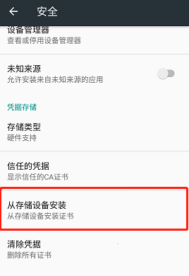 intent未携带任何数据,或者从sdcard上选择证书文件进行安装,也就是在系统设置中选择从存储设备安装证书,如下图: