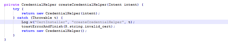从代码可以看出来证书安装过程基本都是依赖于CredentialHelper类完成的,首先掉用createCredentialHelper函数创建了一个CredentialHelper 实例。